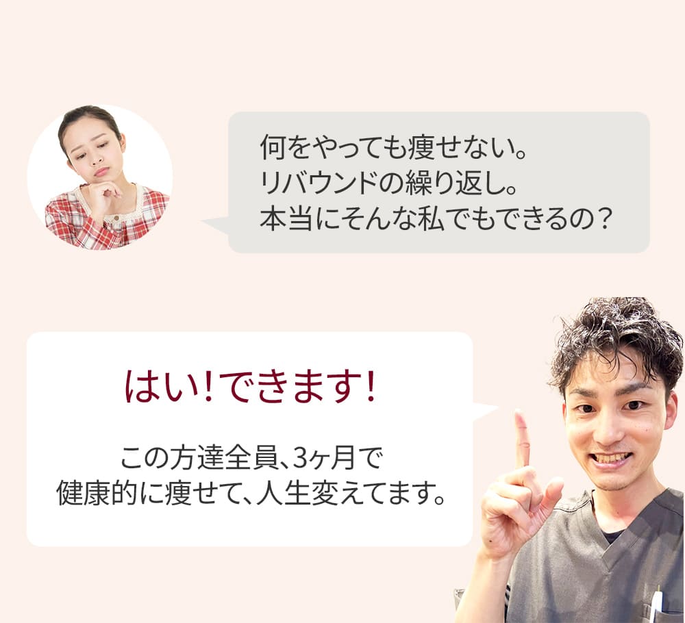 ダイエットを諦めていた方、何をやっても変われなかった方の、 最後の砦となれるよう、お一人お一人に真剣に向き合っていきます。
